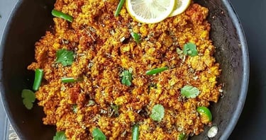 Scrambled indian paneer cooked with peas,onion ,tomato and spices.