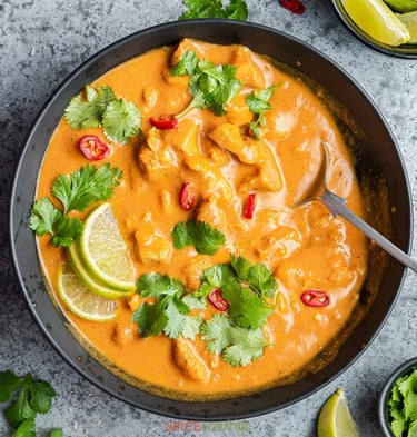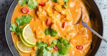 Rich tomato soup infused with coconut flavor.