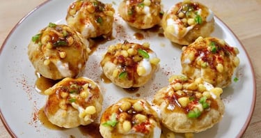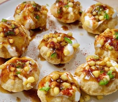 Crispy mini puris stuffed with potatoes, yogurt & chutney.