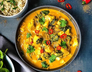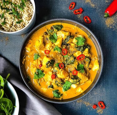 tender fish cooked in creamy spinach with indian spices.