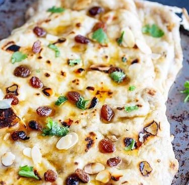 Naan filled with raisins, coconut, and nuts.